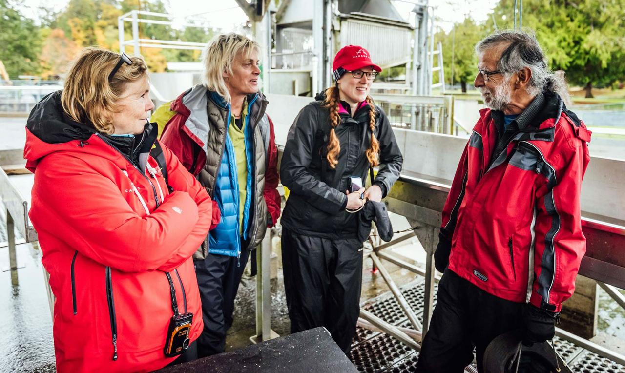 Early this morning adventurous passengers of Canada C3's 143-day voyage crossed the stormy waters of Nanoose Bay to be greeted by Snaw-Naw-As First Nation and the Mount Arrowmsmith Biosphere Region Research Institute (MABRRI) team. After a heartfelt welcome from Councillor Lawrence Mitchell and words of thanks given on behalf of Canada C3 at Snaw-Naw-As First Nation's health centre, passengers were divided into two groups to learn of the Snaw-Naw-As Garden of Spiritual Healing or to participate in a wetland mapping project demostration and geochaching activity at Rathtrevor Beach Provincial Park. The weather was stormy but spirits were high as the groups merged together again afterward for an informative afternoon led by Chief Michael Recalma at the Big Qualicum Fish Hatchery.