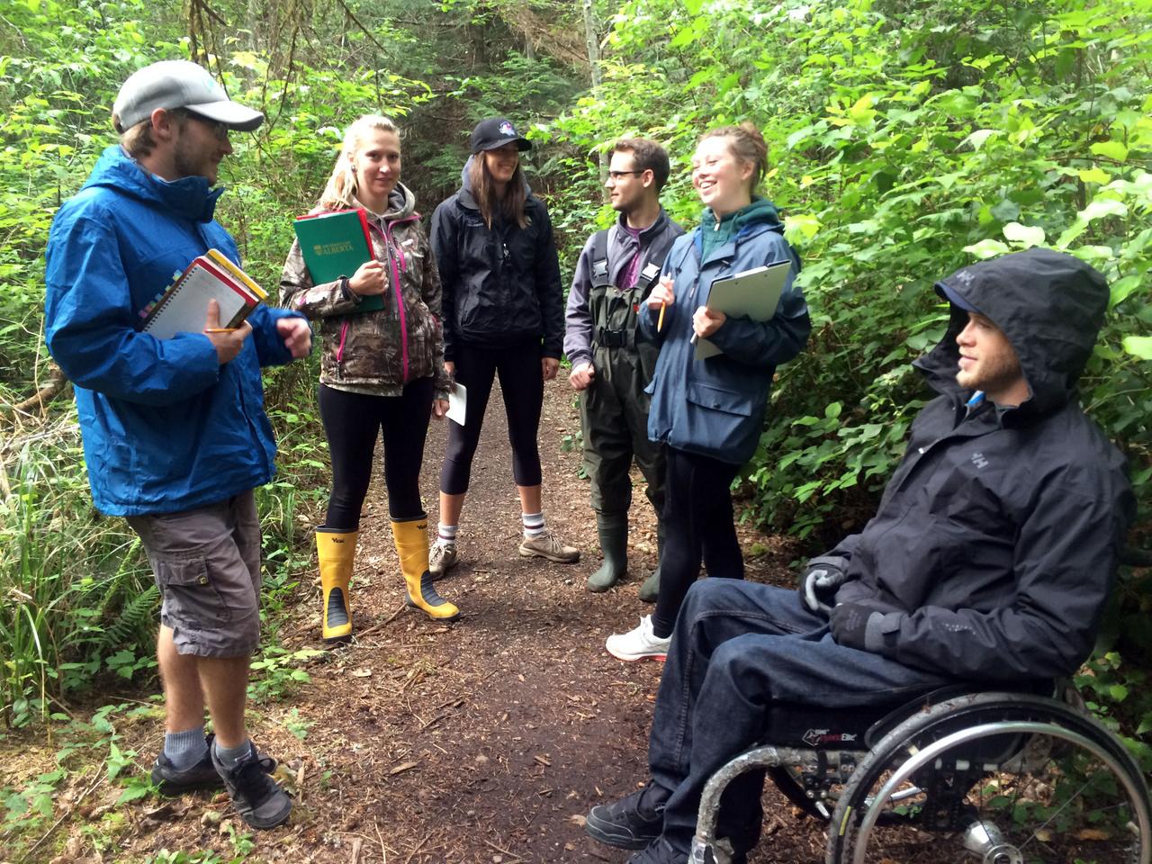 After our team had meandered through this beautiful park, we decided to head south, down to Rathtrevor Beach, which was the location of our next wetland. Once we reached our destination the team geared up again and headed down the trail which was lined with large Douglas-Fir roots that the massive old growth trees have anchored themselves to the earth’s crust with. Upon arrival at the wetland we conducted a couple practice transects, using compasses to find our fore bearing and back bearing, a surveyor chain for measuring distance, and a half meter by half meter quadrat used to distinguish how many organic species are in a given sample area. These techniques allow us to map the wetland and classify the various stages of vegetation present.